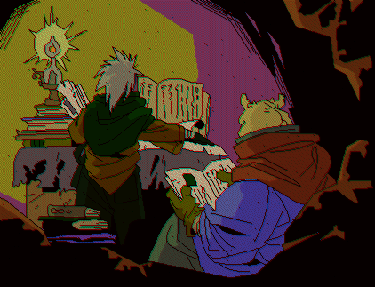 “I have to use other references to help me understand these symbols. Look, we're THIS close to finding out where the correct path to Passing Woods is!” “So you better listen to me when I say it's a delicate work I'm doing here, jackass.” |